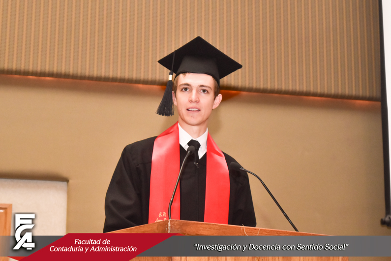 El mensaje de generación fue dirigido por el alumno Larry Berg Fher, pasante de la carrera de Contador Público y representante de los graduandos, quien felicitó a sus compañeros deseándoles lo mejor en sus nuevas vidas como profesionistas: “es un honor para mi poder dirigir unas palabras en representación de todos mis compañeros hoy graduados, agradecemos a las autoridades de la Facultad encabezada por el M.F. Luis Raúl Sánchez Acosta, por formar día con día profesionistas excelentes para servir el día de mañana a nuestra sociedad.” enfatizó Larry Berg Fehr.