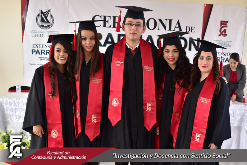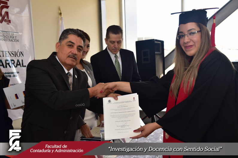 De igual manera el 23 de marzo, se efectuaron las graduaciones en las Extensiones de la FCA, comenzando por Parral, posteriormente Camargo y finalmente Delicias en donde estuvieron presentes Autoridades de los respectivos Municipios, el Dr. Gustavo Alatorre Vallarino, Director de Desarrollo de Estructura y Vinculación de la UACH, en representación del M.E. Luis Alberto Fierro Ramírez, Rector de la UACH; el M.F. Luis Raúl Sánchez Acosta, Director de la Facultad de Contaduría y Administración; el M.A.R.H Ramón Torres Medina, Secretario Académico de la FCA; el M.I. Germán Pérez Hernández, Coordinador General de las Extensiones de la FCA; la M.F. Yolanda Selene Rodríguez Rizo, Recaudadora de Rentas del Municipio de Parral en representación del Lic. Javier Corral Jurado, Gobernador Constitucional del Estado de Chihuahua, el Lic. Diego Molina, Regidor en representación del Presidente Municipal de Hidalgo del Parral, el C. Jorge Alfredo Lozoya Santillán; la M.I. Laura Georgina Carmona García, Coordinadora de la Extensión Parral; el Capitán II de Infantería René Cardona Abarca, en representación del Comandante de la 42/A Zona Militar; el Lic. Raúl Francisco Aguilar Padilla, Recaudador de Rentas del Municipio de Camargo en representación del Gobernador Constitucional del Estado de Chihuahua, el Lic. Javier Corral Jurado; el C. Arturo Zubia Fernández, Presidente Municipal de Camargo; la M.A.R.H. Rosa Emma Fierro David, Coordinadora de la Extensión Camargo; el Ing. Javier Arturo Obando Rodríguez, Recaudador de Rentas del Municipio de Delicias, en representación del Lic. Javier Corral Jurado, Gobernador del Estado de Chihuahua; el Lic Manuel Villanueva Villa, Secretario del Ayuntamiento en represantación del Presidente Municipal de Delicias; el M.A.P. Eduardo Domínguez Arrieta, Coordinador de la Extensión Delicias; y la M.C. Lorena Patricia Licón Trillo, Directora de la Facultad de Ciencias Agricolas y Forestales.