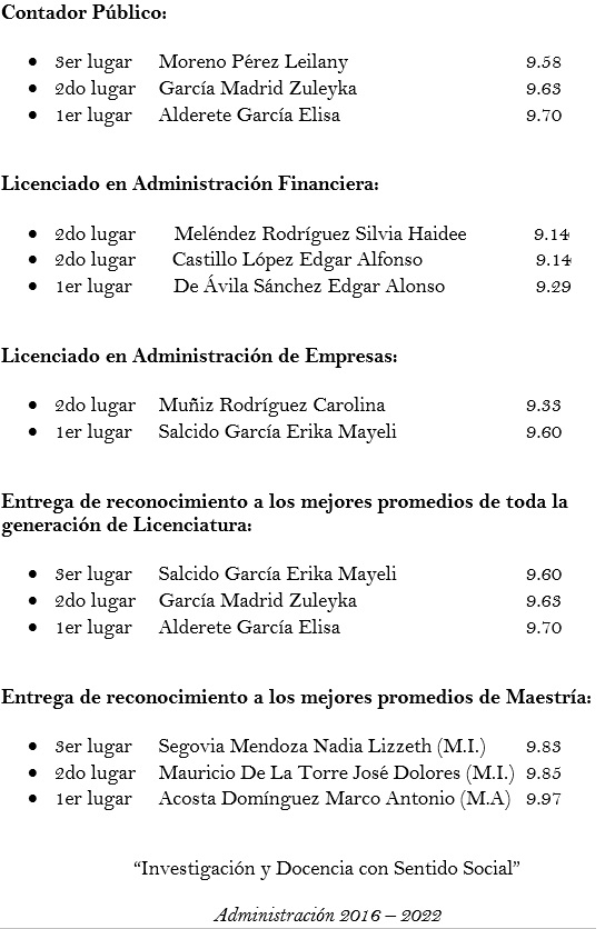 En esta ceremonia estuvieron recibiendo su carta de pasante los egresados de las carreras; Contador Público, Lic. en Administración de Empresas, Lic. en Administración Financiera, Maestría en Impuestos, Maestría en Mercadotecnia, Maestría en Recursos Humanos y Maestría en Administración.