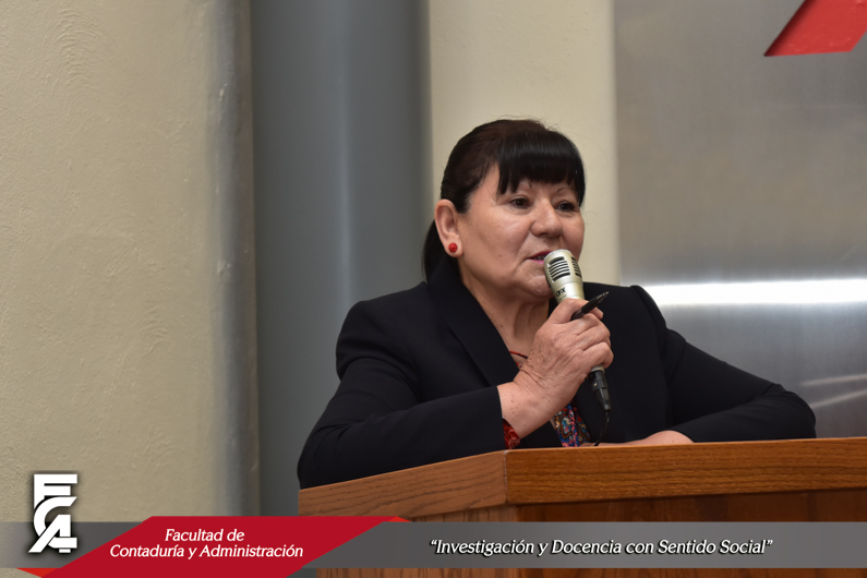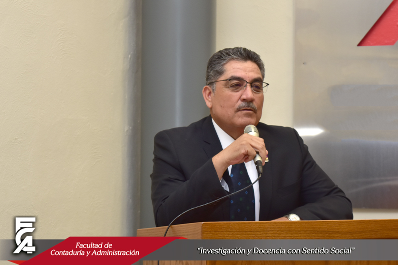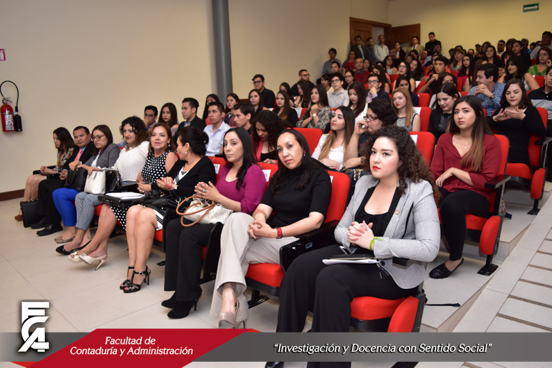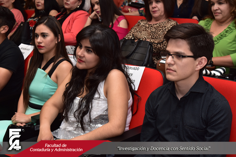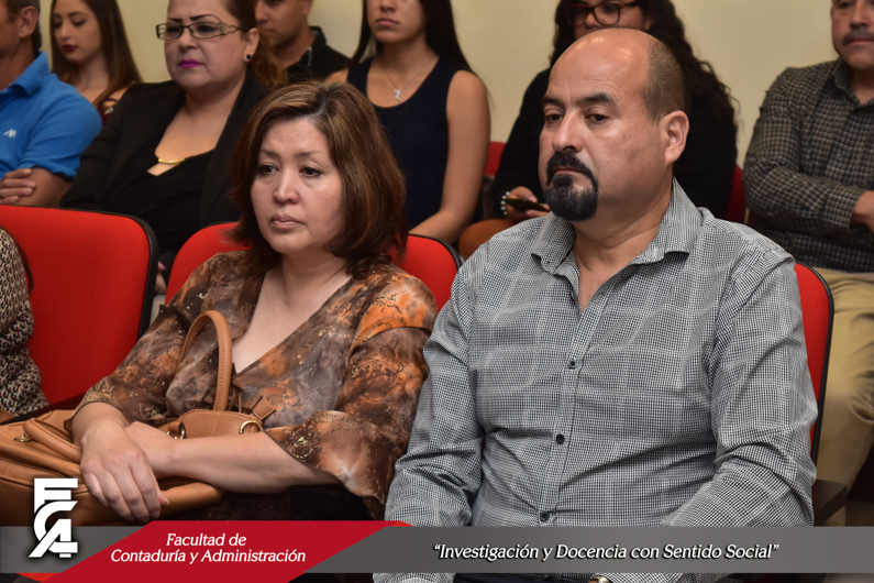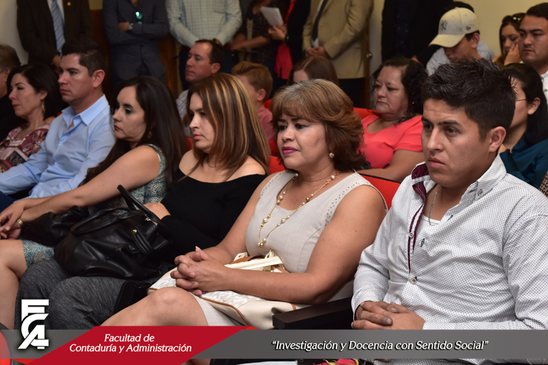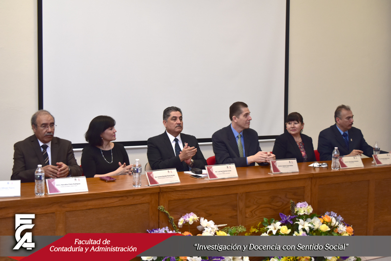 El presídium estuvo integrado por el M.F. Luis Raúl Sánches Acosta, Director de la Facultad de Contaduría y Administración; la Dra. Carmen Romelia Flores Morales, Secretaria de Planeación y Desarrollo Institucional; el M.A.R.H. Ramón Torres Medina, Secretario Académico; el M.A. Servando Salcido Garza, Secretario Administrativo; el M.S.I. Marcelino Fraire Rodríguez, Secretario de Extensión y Difusión Cultural; y la M.A.R.H. Irma Polanco Rodríguez, Pte. de la Academia Aspectos Básicos de Contabilidad.