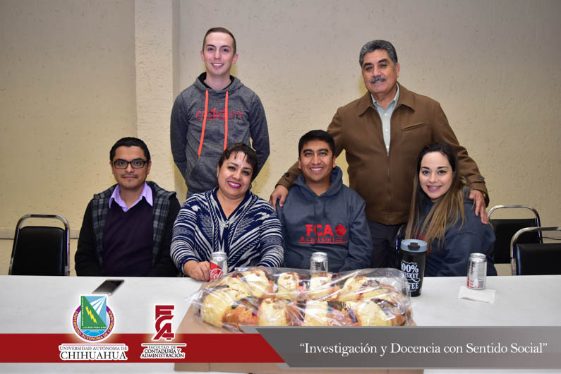 En un ambiente de armonía, compañerismo y fraternidad se llevó a cabo el tradicional corte de la Rosca de Reyes del personal administrativo de la Facultad de Contaduría y Administración de la Universidad Autónoma de Chihuahua. Ceremonia que fue encabezada por el Director de la Facultad, el M.F. Luis Raúl Sánchez Acosta, acompañado de la Dra. Carmen Romelia Flores Morales, Secretaria de Planeación y Desarrollo Institucional; el M.A.R.H. Ramón Torres Medina, Secretario Académico; el M.S.I. Marcelino Fraire Rodríguez, Secretario de Extensión y Difusión Cultural, el M.A.R.H. Servando Salcido Garza, Secretario Administrativo; el Dr. Juan Óscar Ollivier Fierro, Secretario de Investigación y Posgrado y el M.I. Germán Pérez Hernández, Coordinador General de las Extensiones de la F.C.A.