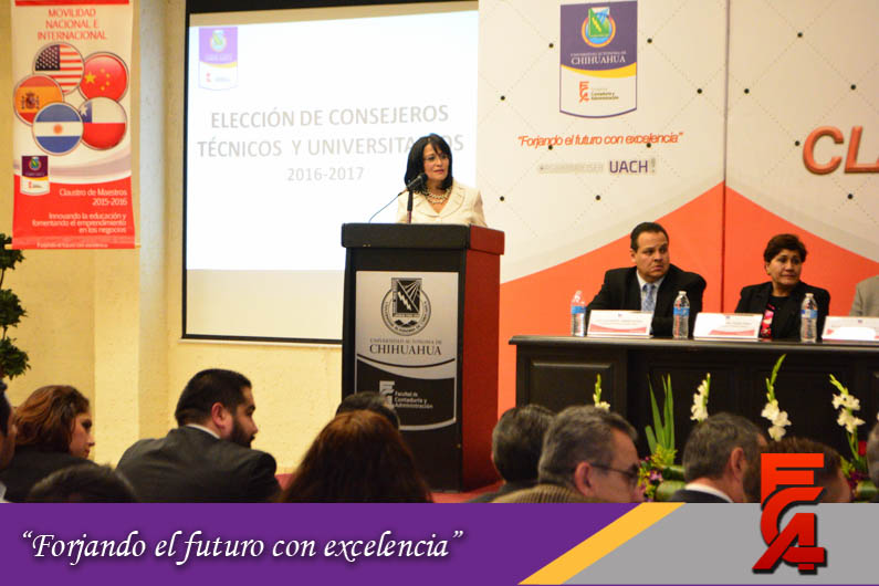 Presidiendo la Directora de la Facultad de Contaduría la M.A.R.H. Liliana Álvarez Loya, así como todos los Secretarios y Coordinadores de las Extensiones de Delicias, Camargo, Parral y Juárez, la funcionaria universitaria manifestó: que “es una sesión de Claustro histórica por lo que representa, ya que hace casi 20 años que no había elecciones en esta Unidad Académica y el proceso fue un ejemplo de civilidad y transparencia y desde luego se atendieron todos los requisitos legales para dar certeza al proceso, estamos muy contentos por la gran participación de la mayoría de nuestros Catedráticos pues es la primera vez en mucho tiempo que asisten más de 490 maestros”.