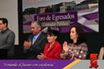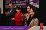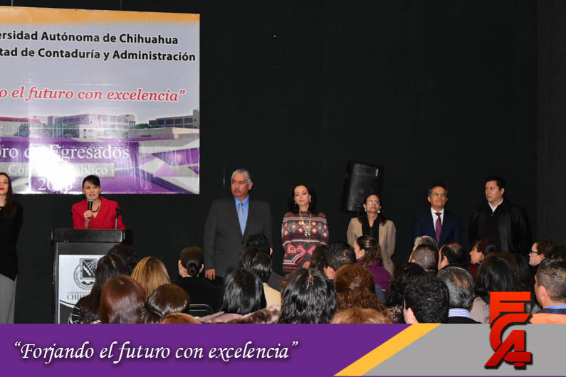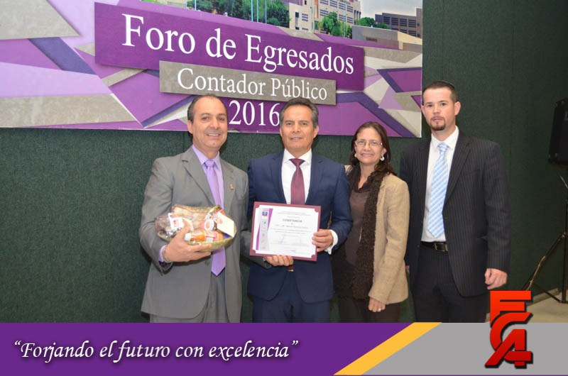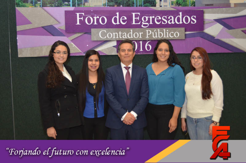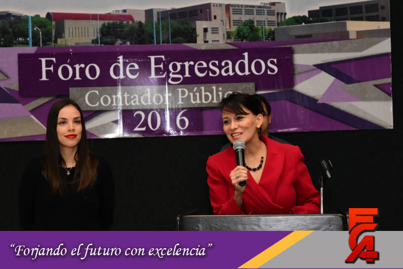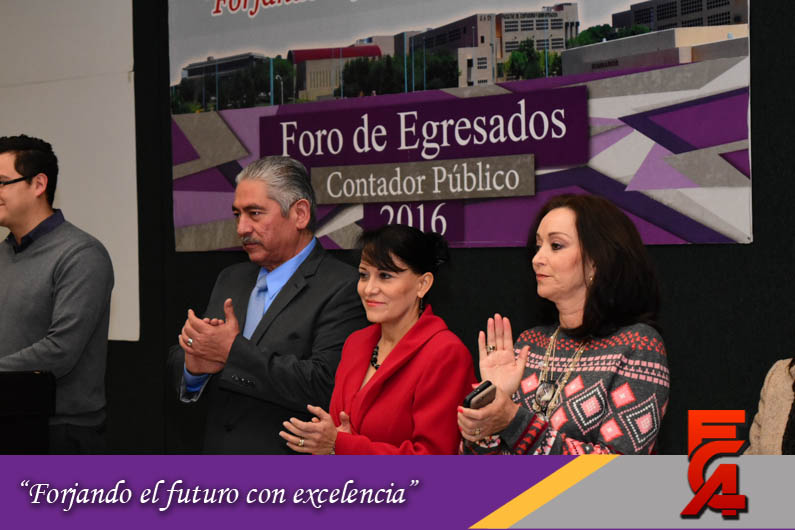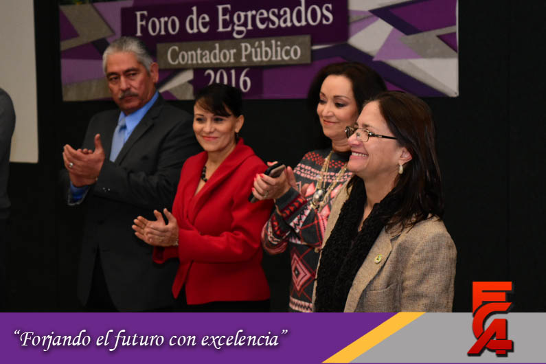 Este Foro de Egresados contó con la participación de la Directora, acompañada por el M.A. y M.F. Armando González, Secretario de Planeación; la M.A.R.H. Guadalupe Maldonado, Secretaria Académica; la M.A. Margarita Álvarez, Secretaria Administrativa; el Lic. Héctor Chacón, Secretario Técnico de la Facultad; la M.I. Cristina Cabrera, Secretaria de Extensión y Difusión; el Dr. Manuel Nevárez, Expositor y Catedrático de la FCA y el M.A. Fernando Durán Coordinador de Seguimiento a Egresados.